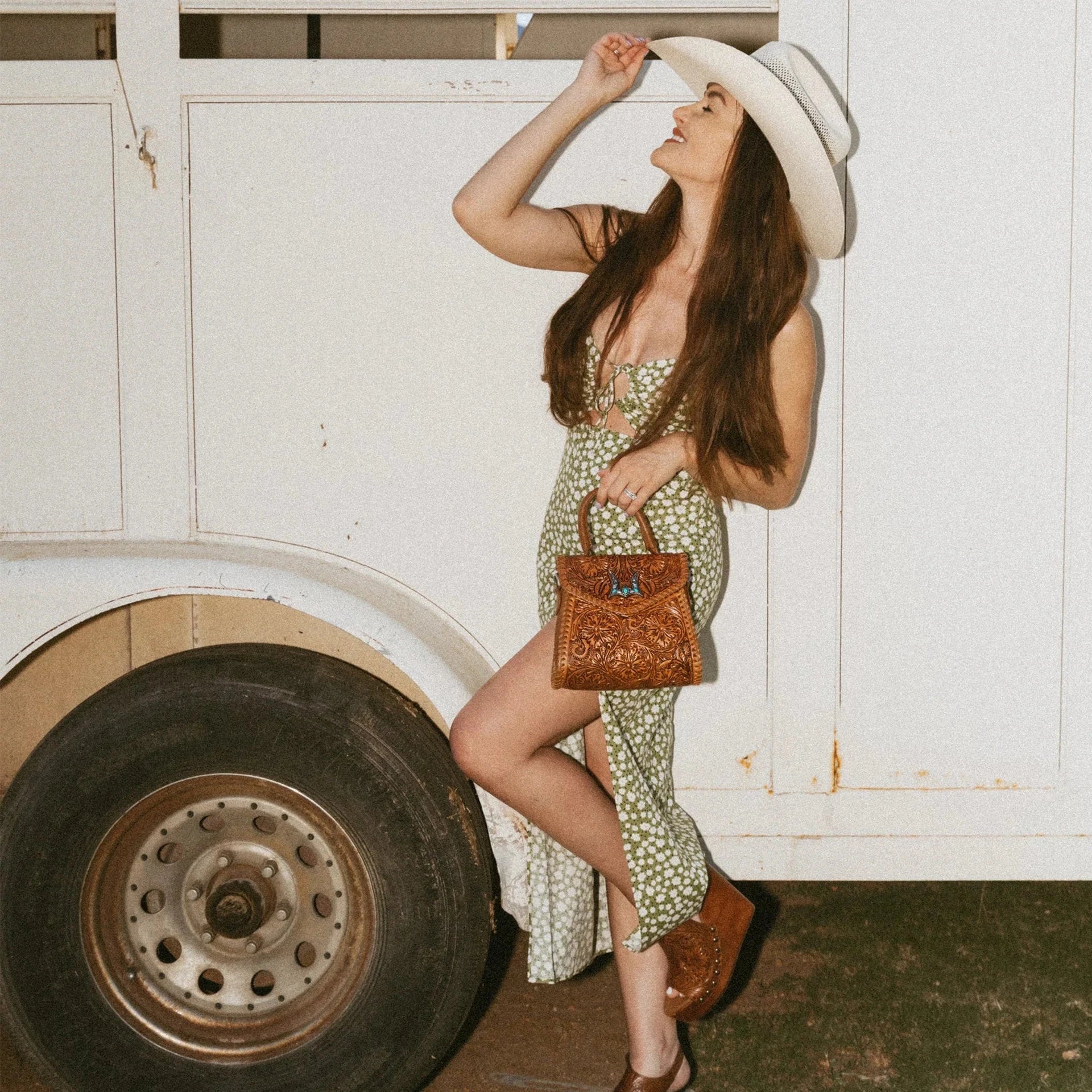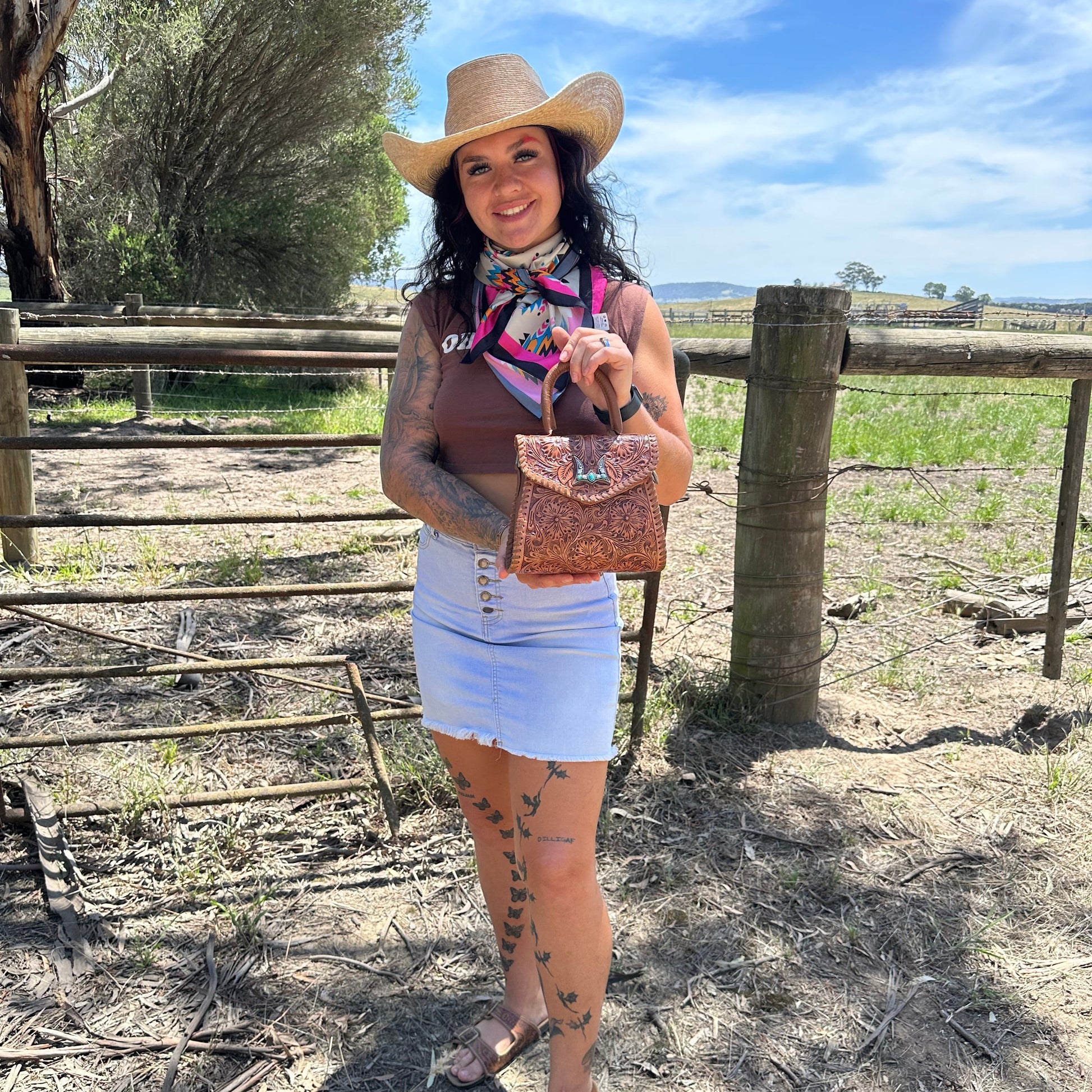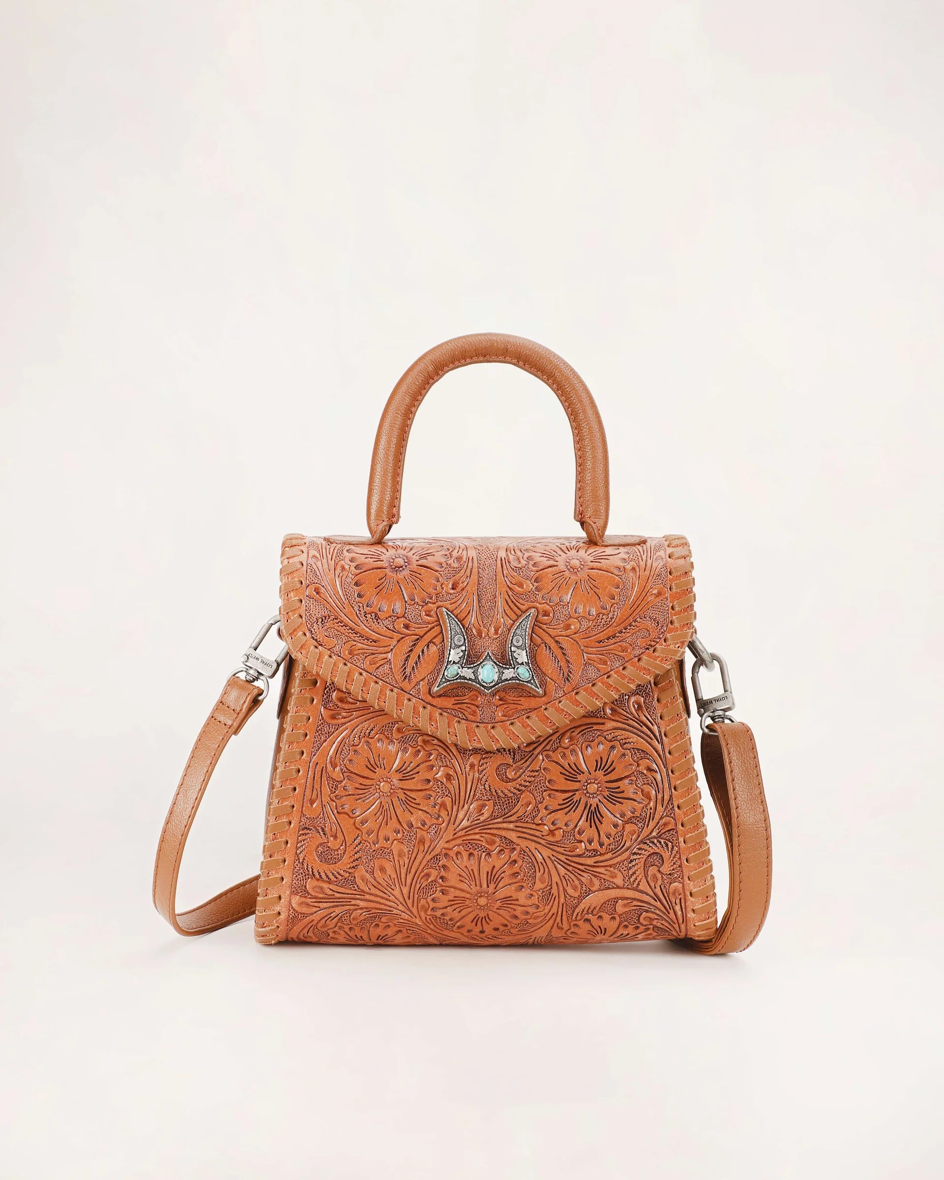 The Leon Mini Handle Purse is a beautifully crafted shoulder bag made from rich handtooled leather and soft calfskin. The intricate tooling on the leather adds a unique, artisanal touch, while the smooth calfskin enhances the bag’s refined appeal.