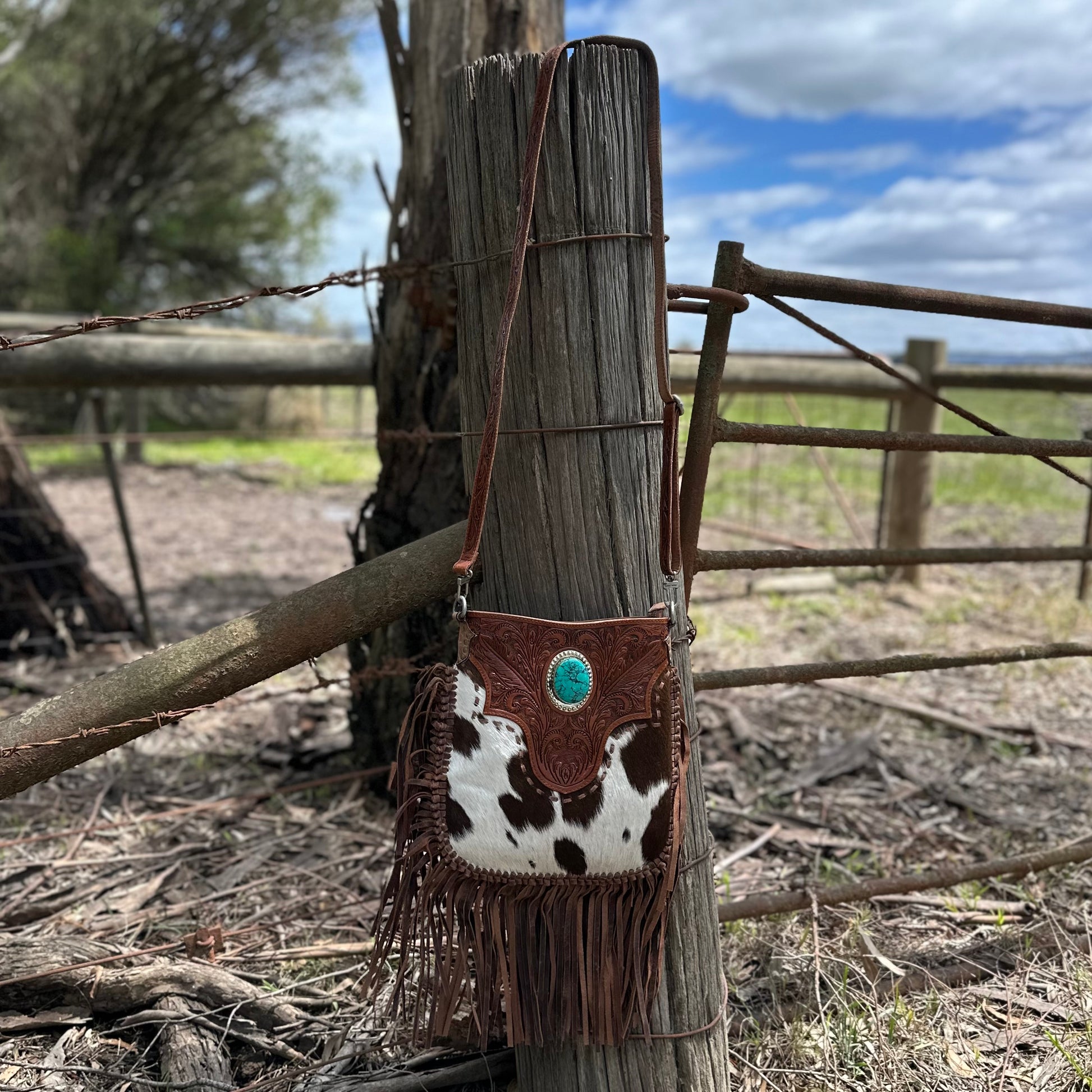 The Painted Desert Tassel Bag combines rugged western charm with refined craftsmanship. Featuring a striking turquoise coloured stone at the centre of the bag, along with intricate tooling and fringed details, this bag exudes a rich, artisanal appeal. The hair-on leather adds a unique texture, elevating the bag’s bold, desert-inspired design.