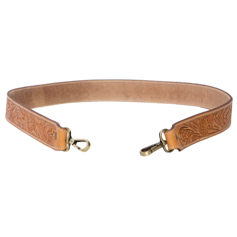 This stunning tooling leather bag strap is designed to be interchangeable with your favourite cross body bag. This strap features hand tooling leather on the outside with contrast stitching and plain leather on the inside, finished off with brass hardware.