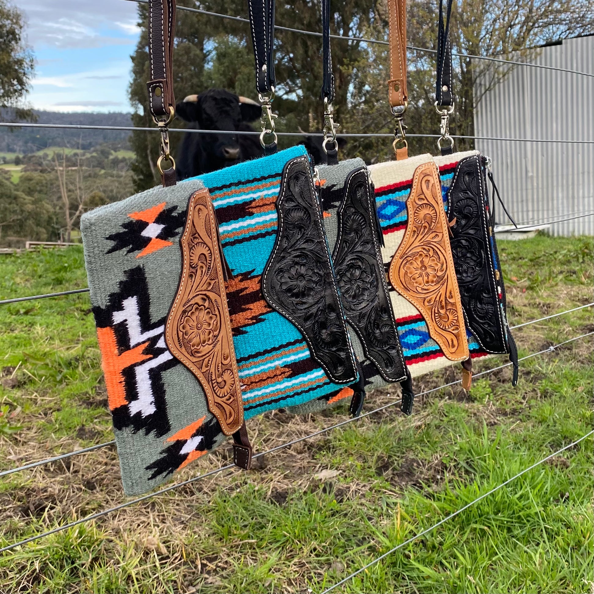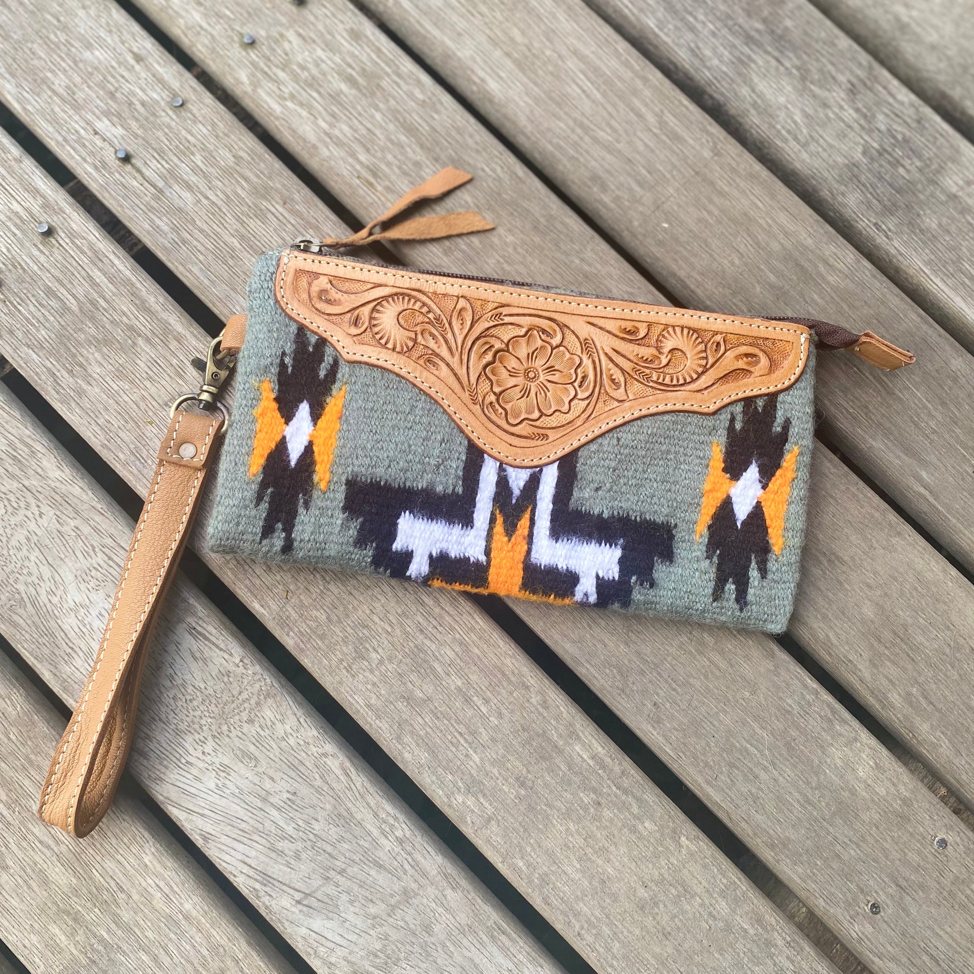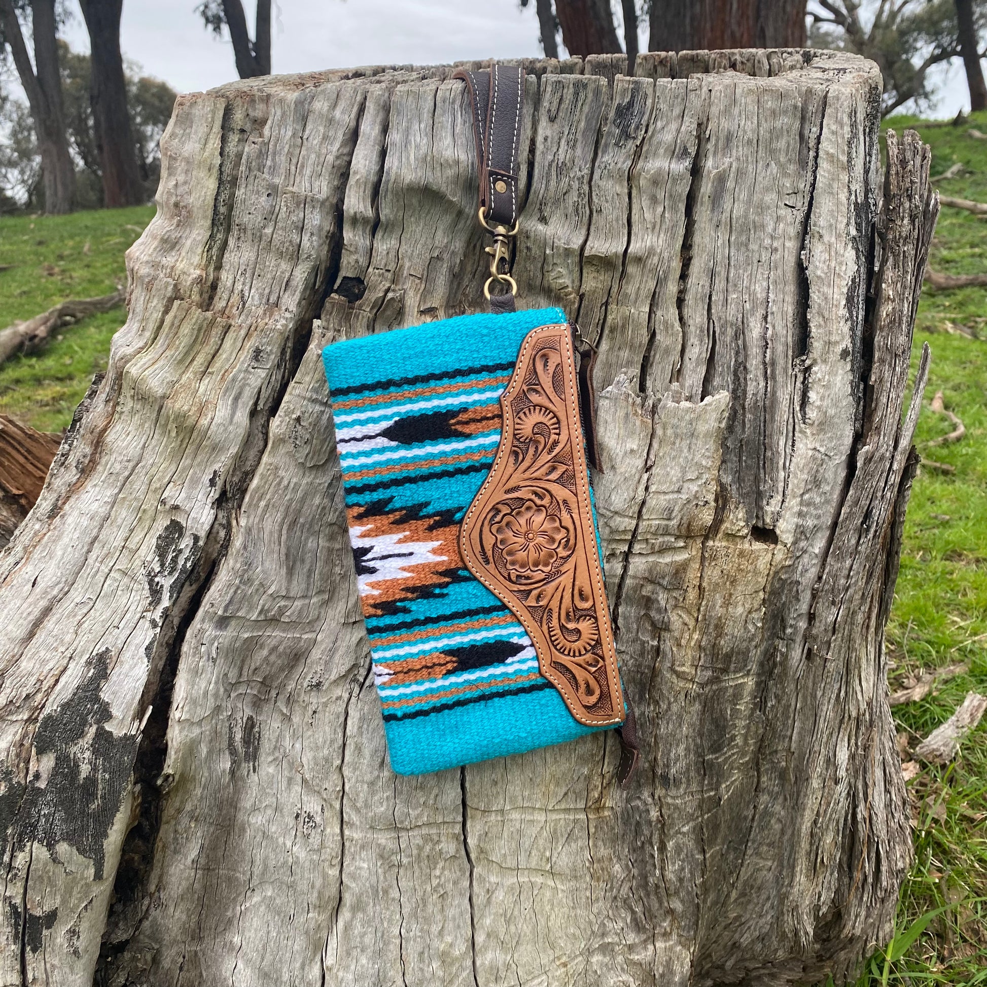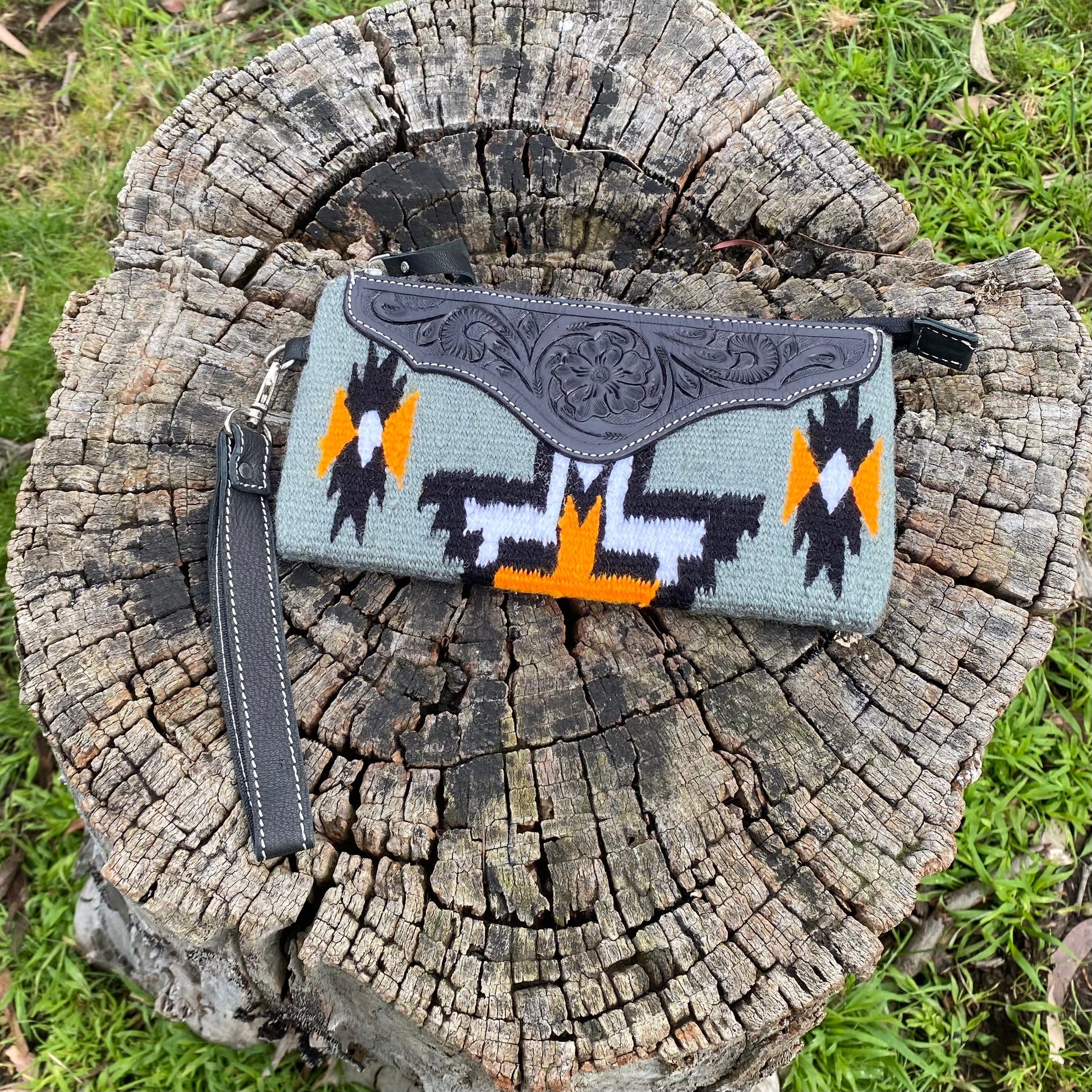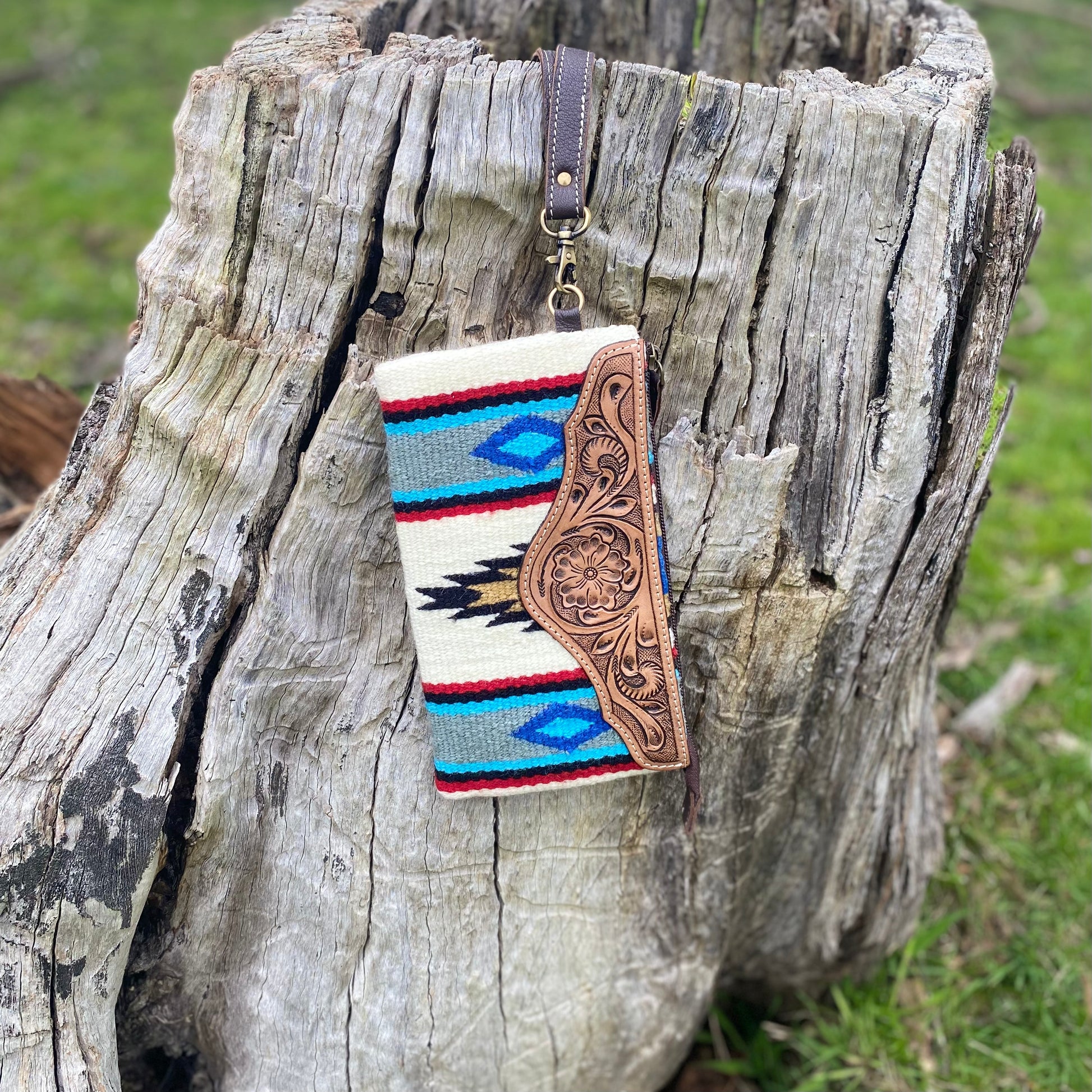 This must have zippered purse with intricate hand tooled details along with 100% Hand Woven Wool Saddle Blanket Fabric on the front panel adds touch of excitement and romance to your everyday life. It can be used as a large coin pouch, a make-up purse or as a last minute Tooled Saddle Blanket Clutch for a night out on the town.